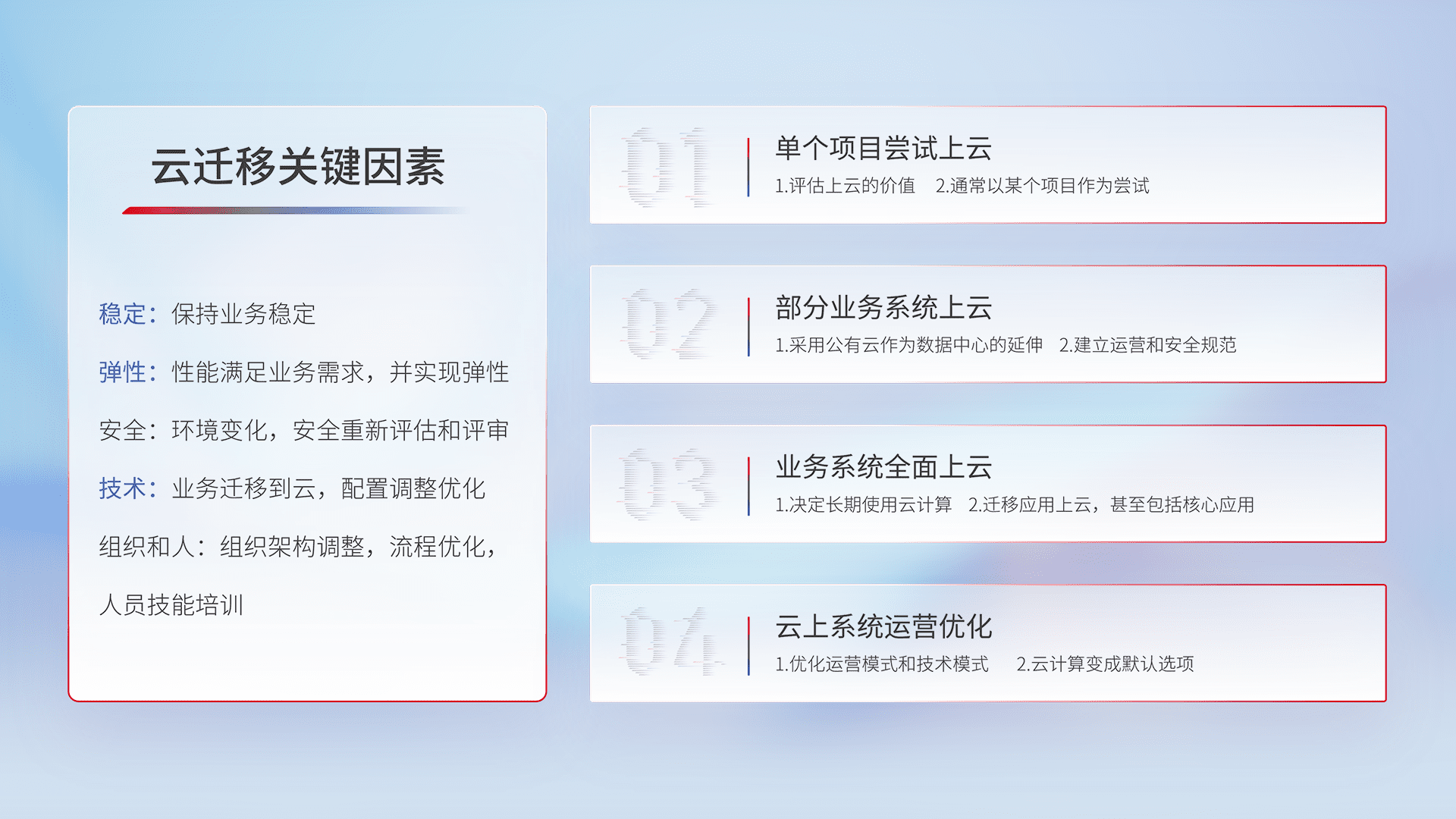 结合实际业务,,,,从规划设计、、、、云平台选型、、云原生改造、、、数据迁移、、集成交付,,迁移全过程为客户识别最佳上云路径,,,做好风险识别管理,,,,设计网络架构、、身份权限、、、安全审计合规、、、、操作审计、、、日志审计、、监控告警策略、、、多站点容灾设计等,,,,对云上基础设施进行整体规划,,,,提升IT治理水平,,,以满足弹性、、高可用、、、、高性能的需求。。